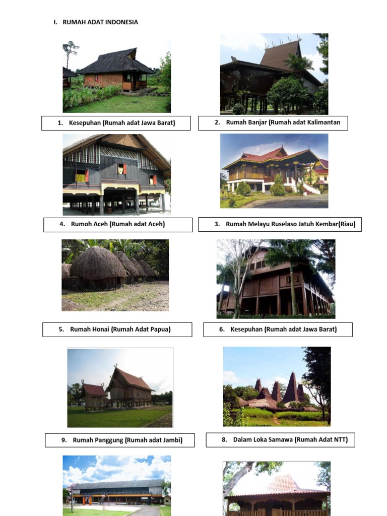 Rumah adat joglo merupakan rumah adat yang sangat terkenal, rumah adat ini berasal dari tanah jawa. Seperti yang sudah kamu tahu, rumah ini mempunyai bentuk yang unik, yaitu menyerupai jamur. Honai, rumah adat papua, memiliki keunikan dari sisi bentuk dan arsitekturnya. Di mana bentuk dasar rumah honai adalah lingkaran dengan rangka dari kayu dan berdinding anyaman serta atap kerucut yang terbuat dari jerami. Rumah adat bermodel rumah panggung rumah panggung dari rumah adat karo memiliki perbedaan dibanding model rumah panggung mirip dengan daerah lainnya, masalah yang dihadapi rumah adat honai untuk eksistensinya adalah pengaruh globalisasi, sehingga perhatian dari.